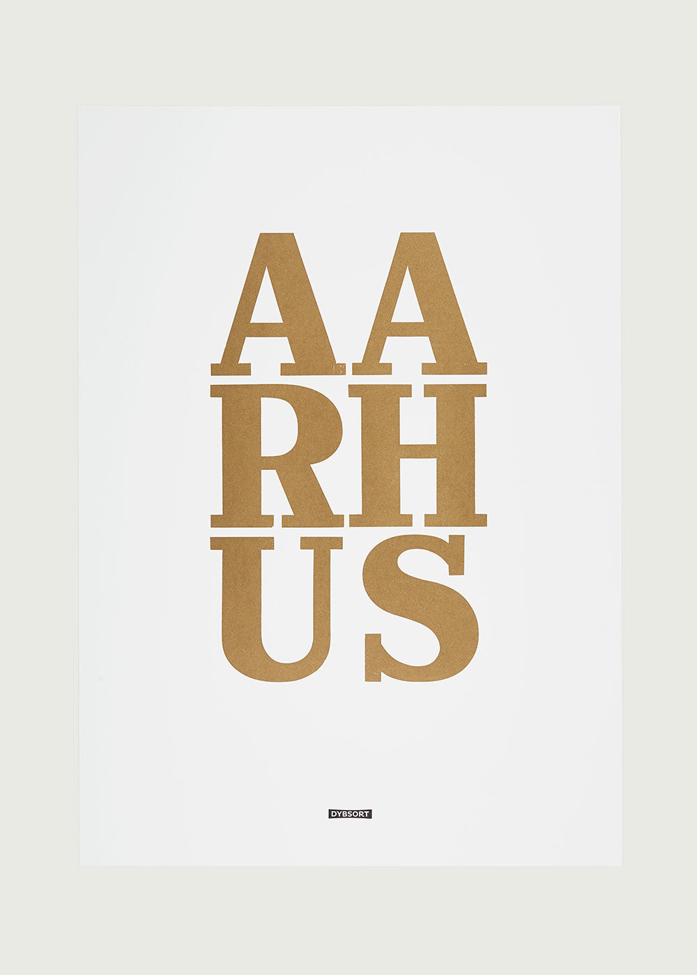 Guld på hvidt bomuldspapir fra Somerset-fabrikken i England. Bogtrykt lokalpatriotisme med stil. Den er nemlig trykt med håndkraft med store smukke egyptienne trætyper.