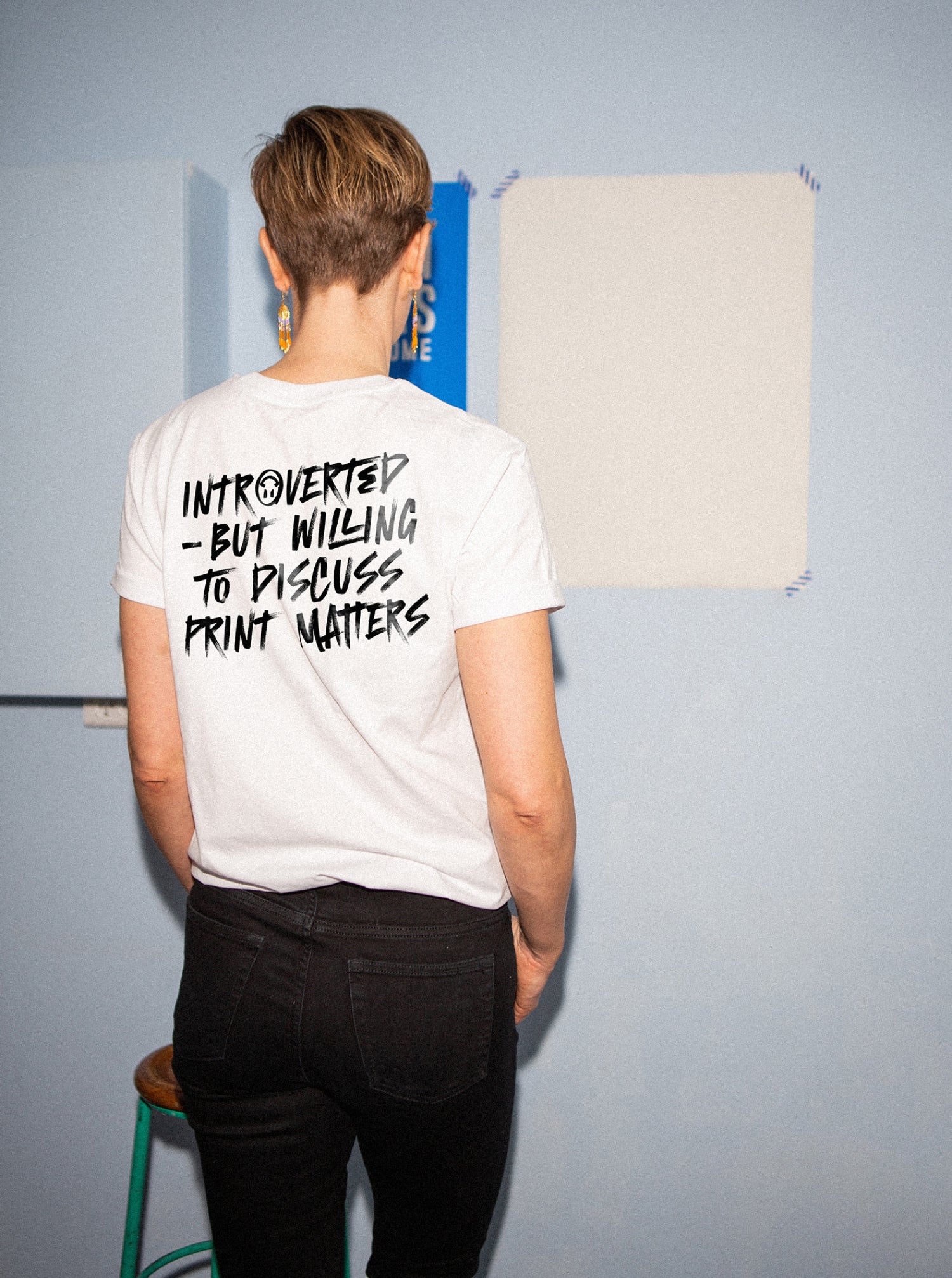 Råhvid Tee med sort rygprint med teksten: INTROVERTED AND WILLING TO DISCUSS PRINT MATTERS. Lille brystprint, hvor der står Hello.
