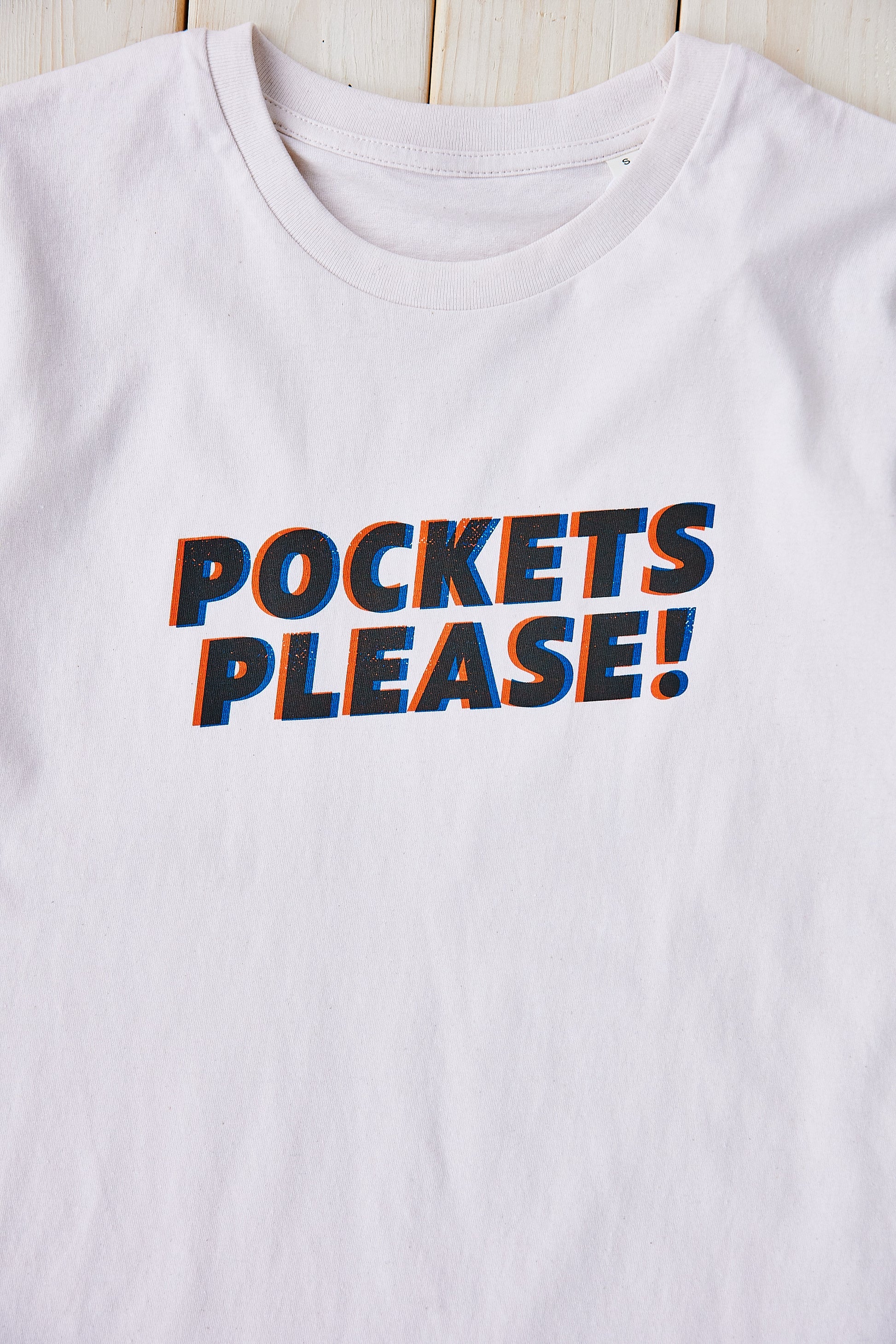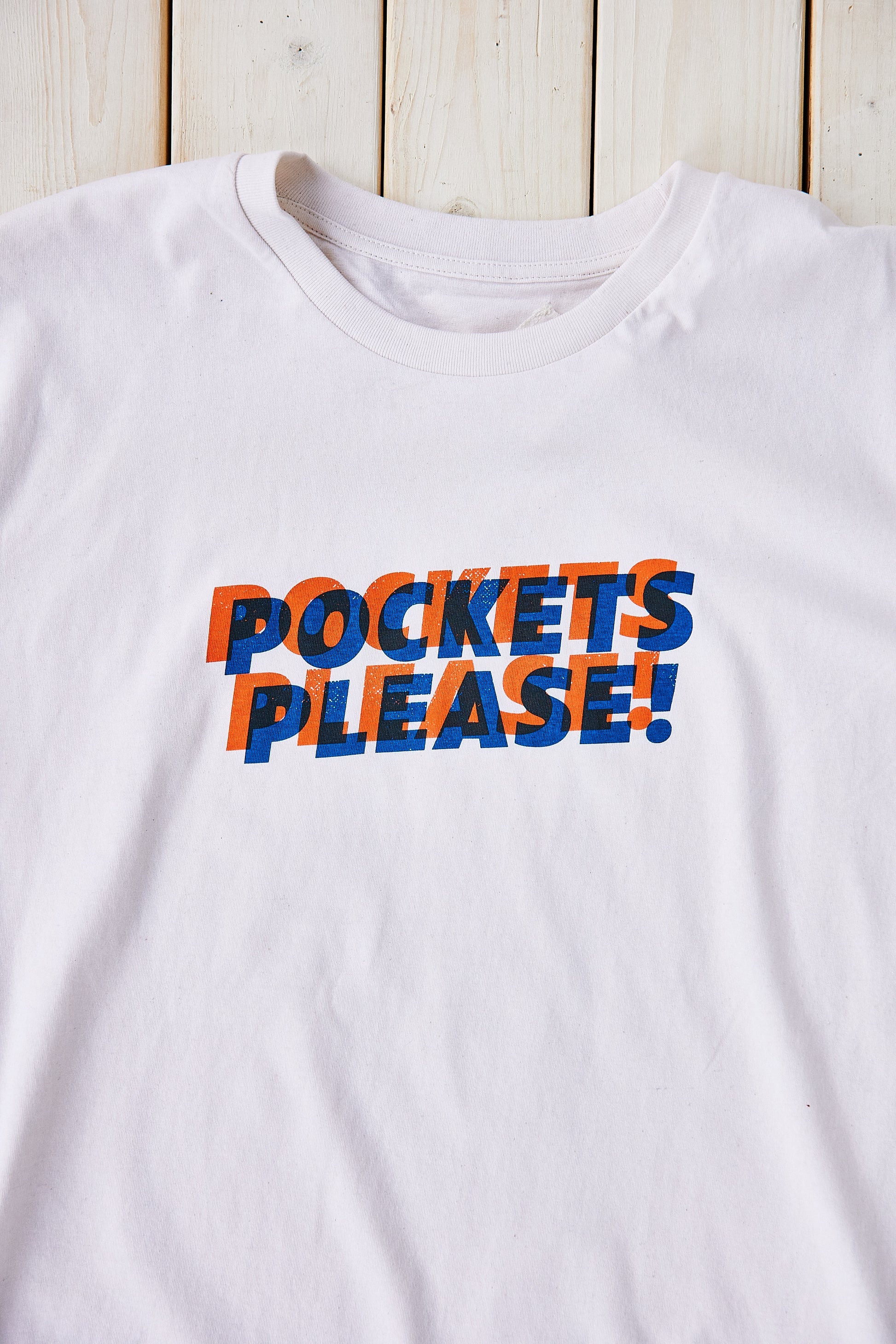 Off-white Tee med koral og blåt front-print med teksten: POCKETS PLEASE!