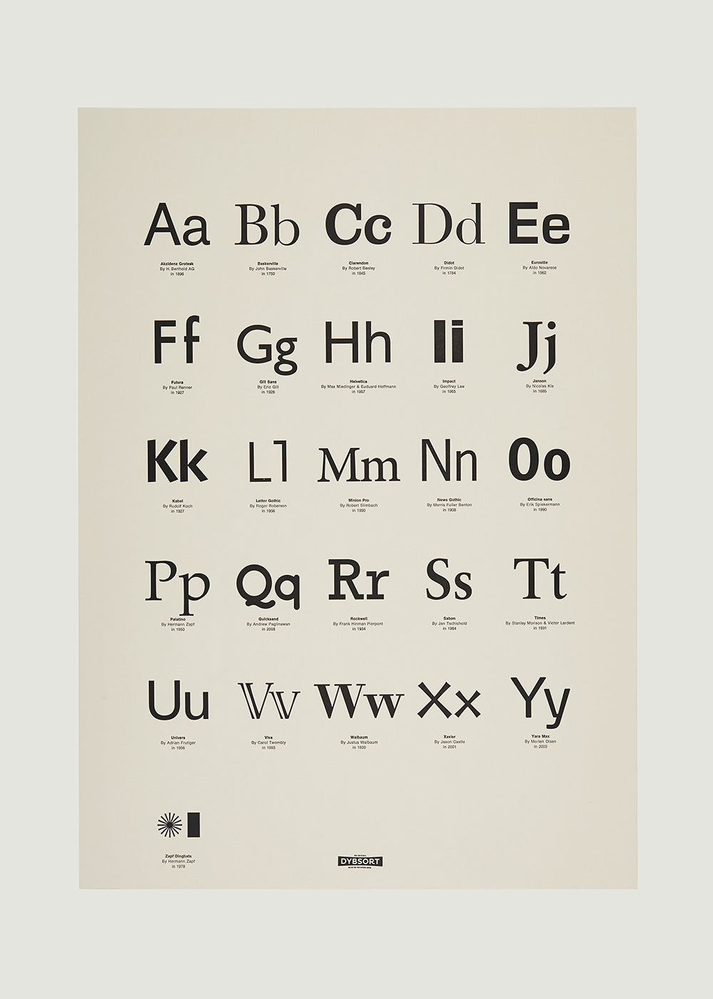 Klassikere og nyklassikere inden for skrifttyper lined op alfabetisk med navn, årstal og designer. Håndtrykt med kærlighed på 100% bomuldspapir. Den fontinteresseredes musthave, men også et smukt værk til de der mangler lidt på væggen i stuen.
